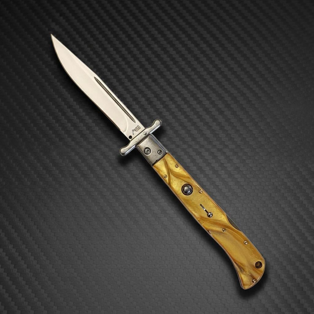 The AKC 11" Roma Swinguard in Yellow Pearl blends iconic Italian design with smooth, dependable automatic performance. This striking stiletto showcases refined lines, rapid deployment, and the unmistakable character that defines the legendary Swinguard series.