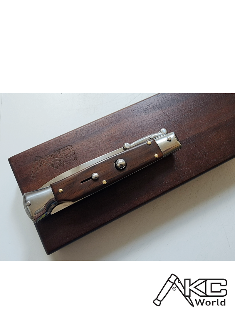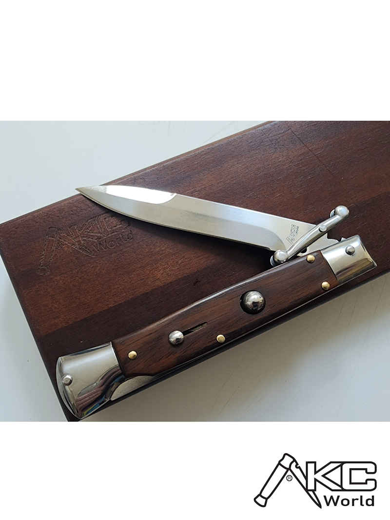 The AKC Swinguard 9" Automatic Italian Stiletto Red Pakka Wood (4" Polish Bayonet) is an impressive pocket knife with a powerful bayonet blade that releases at the push of a button. Crafted with premium materials, this classic Stiletto style includes a sliding safety to protect against accidental release and a secure lockback mechanism. Add this unique Italian knife to any collection and be sure to turn heads.
